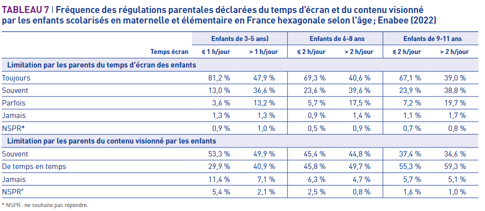 – la fréquence des régulations parentales déclarées du temps d’écran et du contenu visionné par les enfants scolarisés en maternelle et élémentaire :