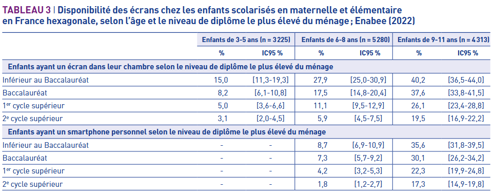 – la disponibilité des écrans selon l’âge et le niveau de diplôme le plus élevé du ménage