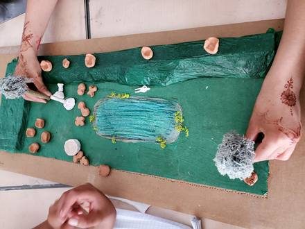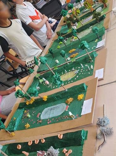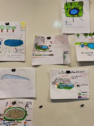 En 2024-2025, les élèves de 5ème (Bikila, Dirola, Tulu et Thugane) ont travaillé en art de l’espace autour de la mare pour réfléchir à son aménagement en fonction des différents usages du lieu (usages pédagogiques et usages de détente/repos).