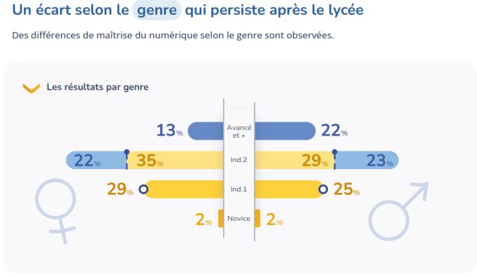 4 étudiants sur 10 de Licence 1 demeurent en dessous du niveau attendu à la fin du Lycée. Un écart de genre est observé: 22 % des étudiants atteignent les niveaux les plus avancés contre seulement 13% pour les étudiantes. Les résultats complets: